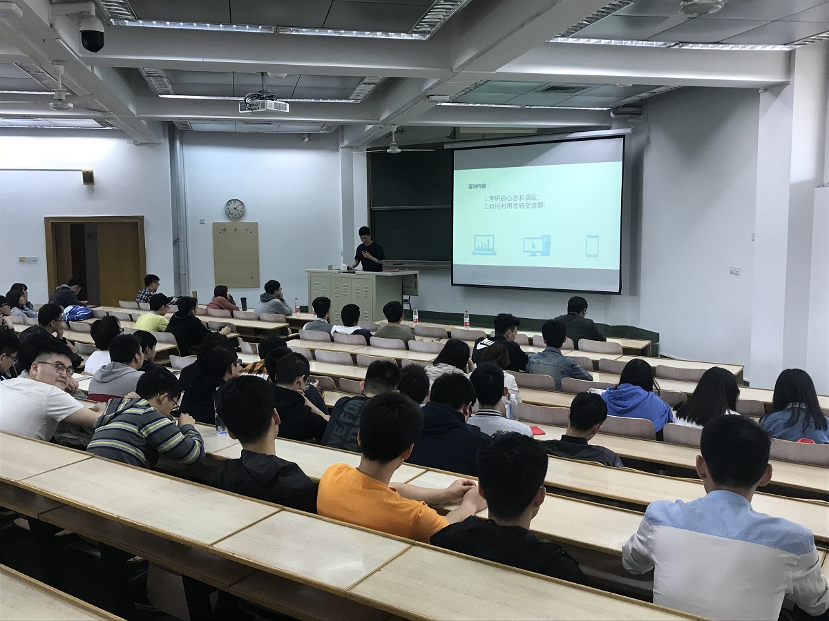 会上,2019年考研已被录取的15级学生代表汪云峰、梁欢、罗嗣梧、张霄分别从学校的选择、专业的学习、复习进度安排、心态的调整等方面与大家分享了考研的体会,为即将考研的16级同学提供了宝贵的经验。