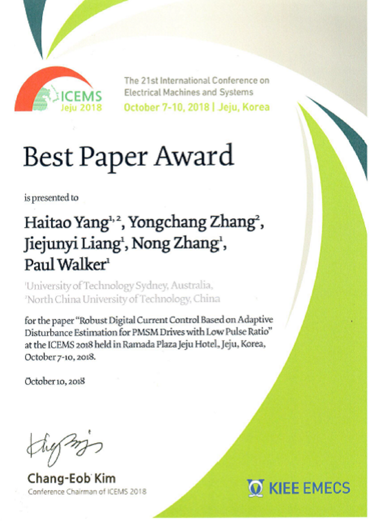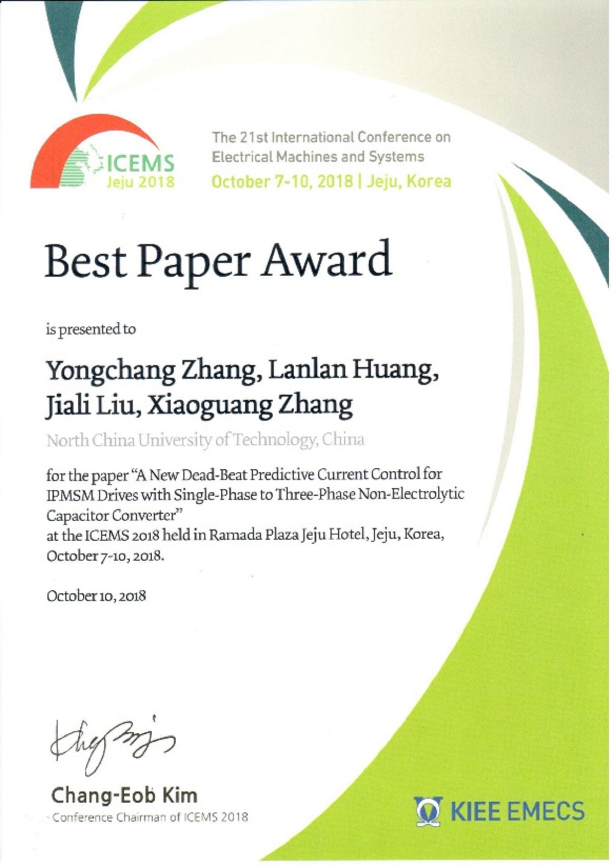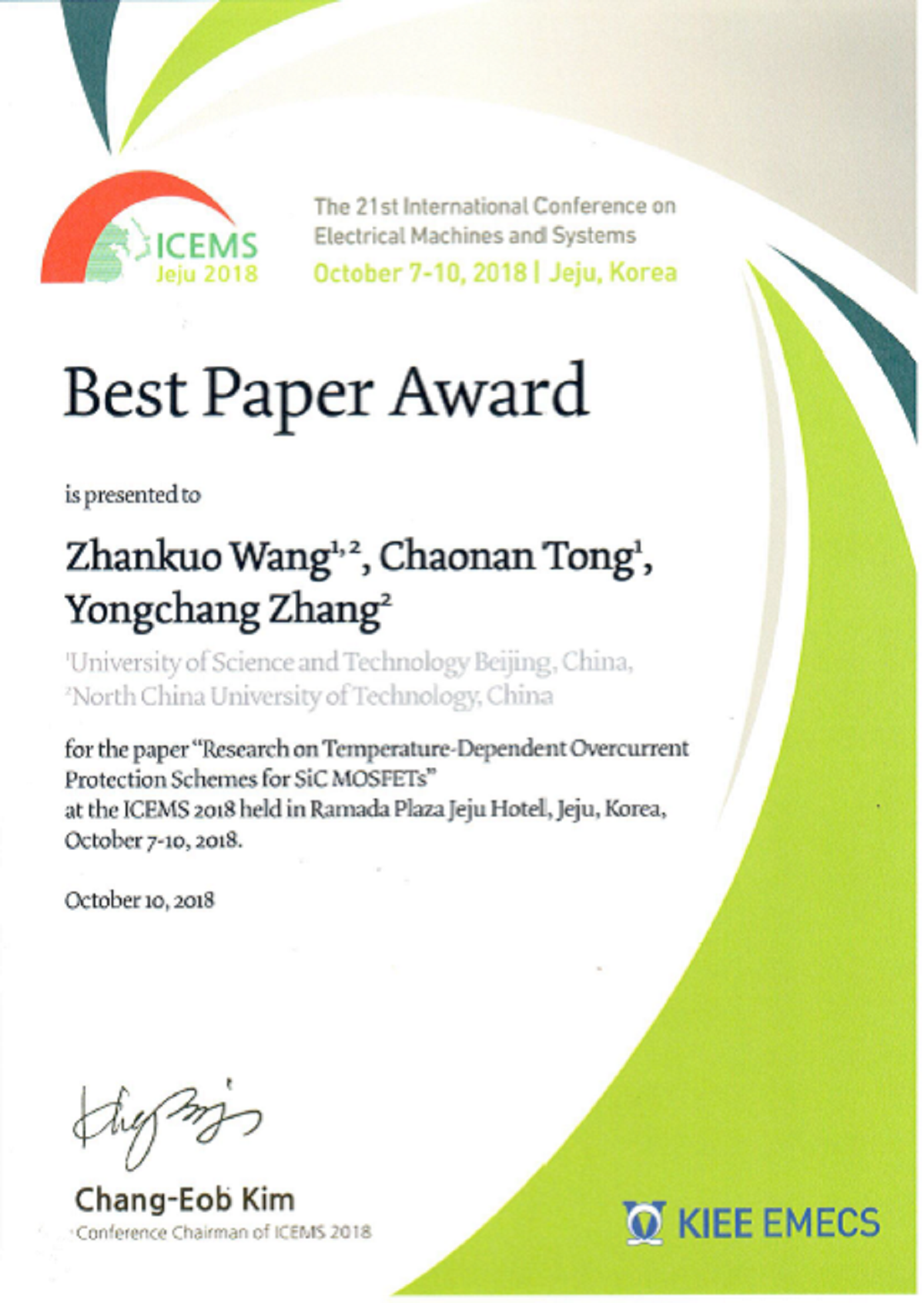 在本次会议上共发表论文15篇,参会14人。3篇获奖论文为:张永昌、黄兰兰、刘家利和张晓光完成的论文《A New Dead-Beat Predictive Current Control For IPMSM Drives With Single-Phase To Three-Phase Non-Electrolytic Capacitor Converter》;王占扩、童朝南、张永昌完成的论文《Research on Temperature-Dependent Overcurrent Protection Schemes for SiC MOSF ETs》;杨海涛、张永昌等完成的论文《Robust Digital Current Control Based on Adaptive Disturbance Estimation for PMSM Drives with Low Pulse ratio》(杨海涛为金沙官方网站电气学科毕业研究生,现在澳大利亚悉尼科技大学攻读博士学位)。金沙官方网站师生的论文展示赢得了各地学者的认可,展现了金沙官方网站电气学科研究团队的科研实力和学术风采。