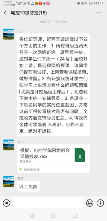 网络班会详情报表》,收集汇总同学们在在线课堂、选课、补考、毕业设计、就业、考研等各方面的问题,尤其是开始远程上课后,建立教学答疑群,第一时间回复学生。三是继续实时精准掌握学生情况。排查班级每位学生,核对每名同学的实时位置,全面准确掌握学生动态,再次向全体同学强调 “不离家、不返校、在家学习” 。