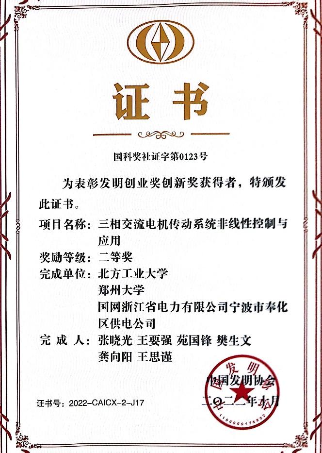 近日,中国发明协会公布了2022年度“发明创业奖·创新奖”名单,金沙官方网站作为第一完成单位申报的项目“三相交流电机传动系统非线性控制与应用”获得二等奖。