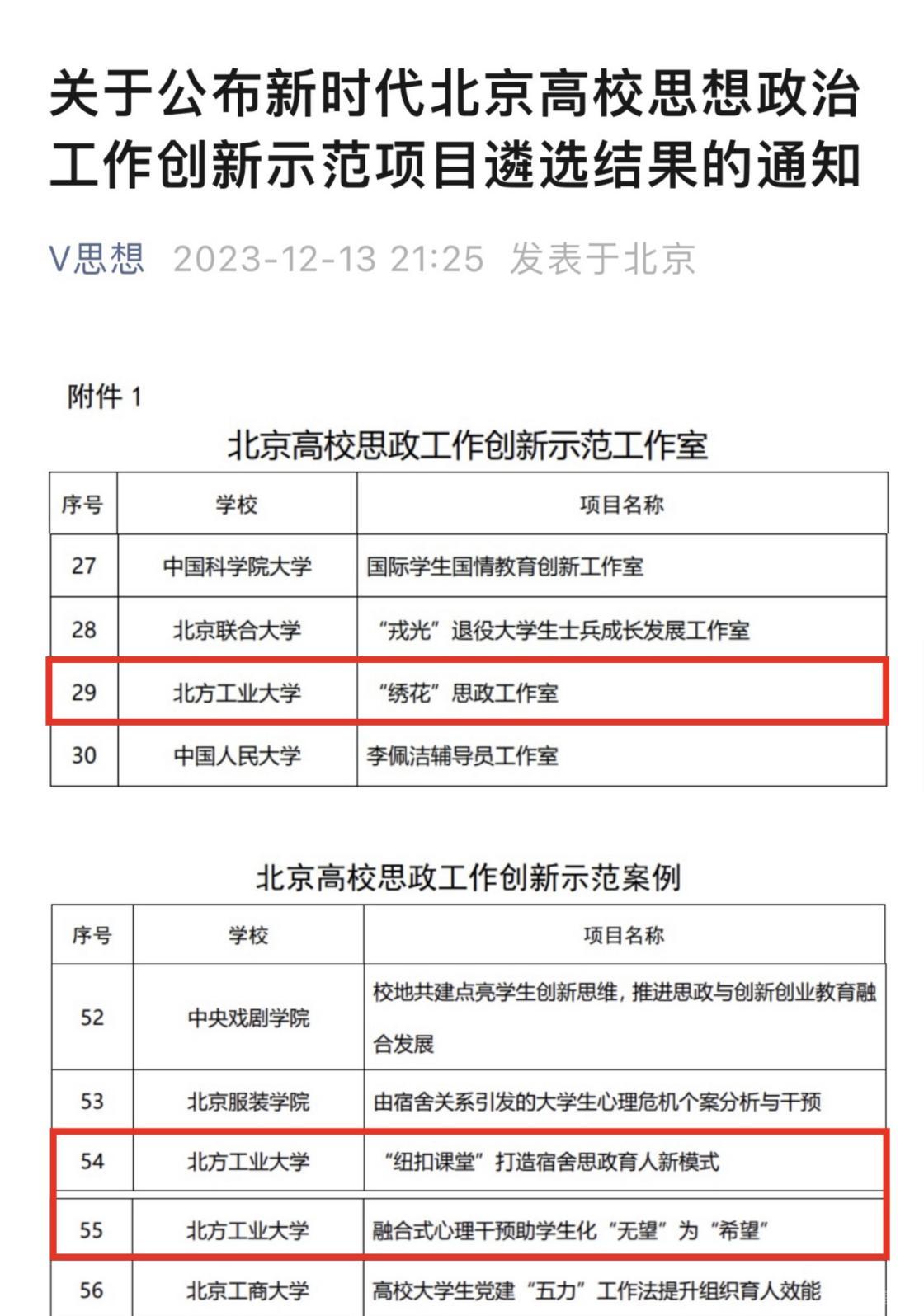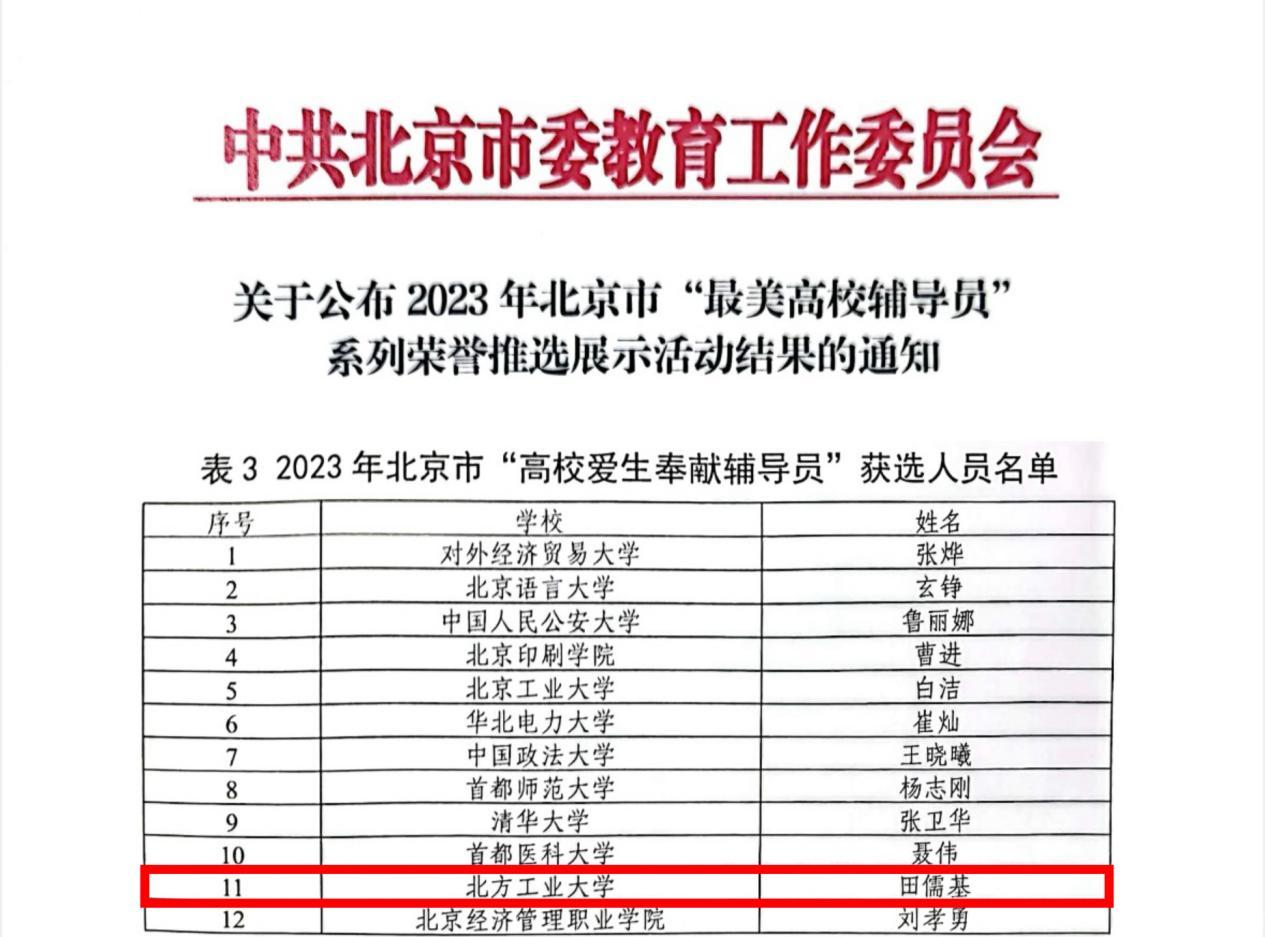 辅导员田儒基获评2023年北京市“高校爱生奉献辅导员”荣誉称号,“绣花”思政工作室入选“北京高校思政工作创新示范工作室”,《“纽扣课堂”打造宿舍思政育人新模式》《融合式心理干预助学生化“无望”为“希望”》案例入选“北京高校思政工作创新示范案例”。