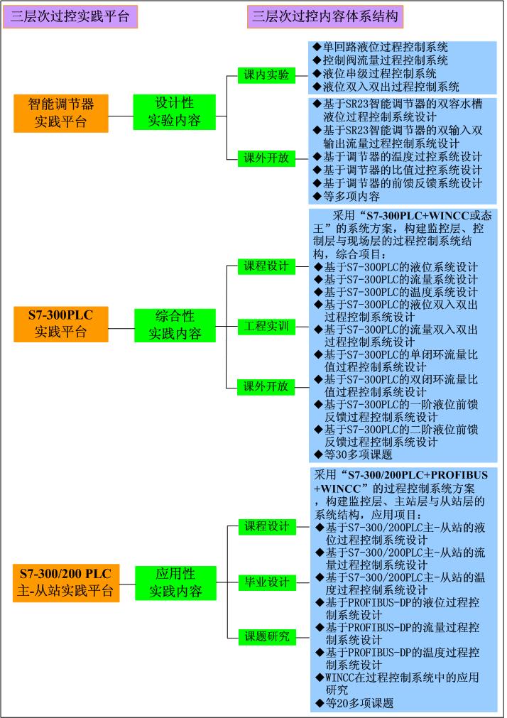 建设了“SR23智能调节器、S7-300PLC、S7-300/200PLC主-从站”三层次的过程控制系统实践平台,为过程自动化控制技术应用型人才培养提供了先进的硬件环境。